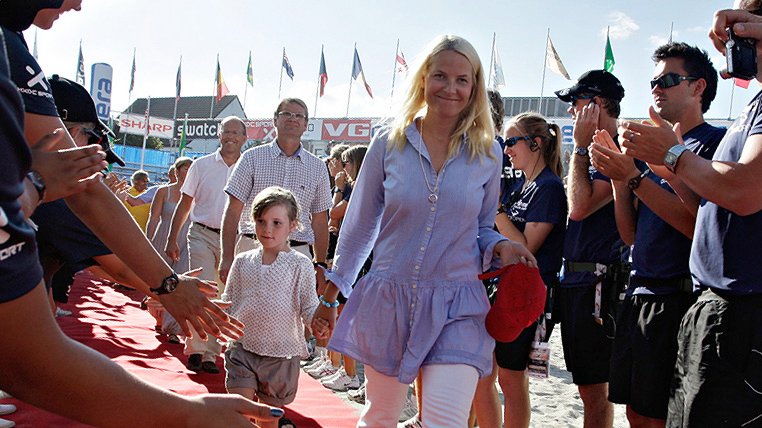 Norway`s Crown Princess Mette-Marit and her daughter Princess Ingrid Alexandra is greeted by officials during the FIVB World Tour 2010 beach volleyball tournament in Kristiansand August 15, 2010
