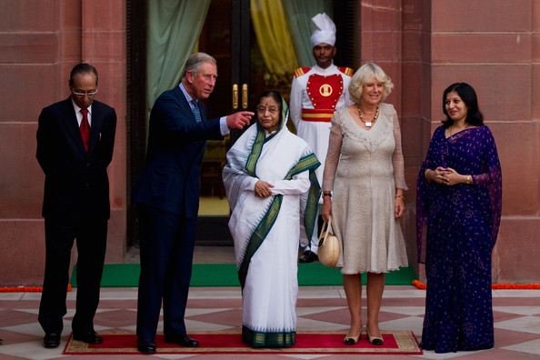 TRH Prince Charles, Prince of Wales and Camilla, Duchess of Cornwall stand with Indian President Pratibha Patil and her daughter, Jyoti Rathore on the first day of their four day visit to India in the garden of the presidential palace on October 2, 2010 in New Delhi, India. Prince Charles will be opening the Commonwealth Games on behalf of The Queen on October 3, after which Their Royal Highnesses will undertake a series of engagements throughout India.