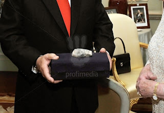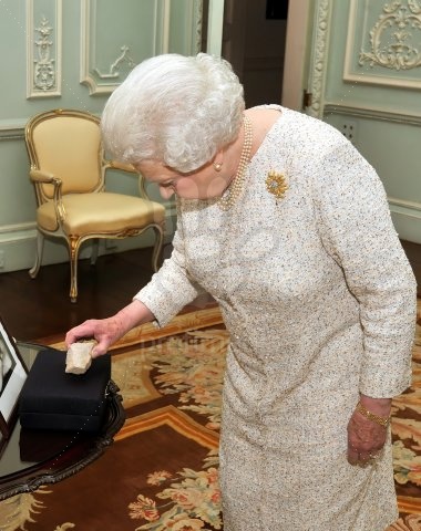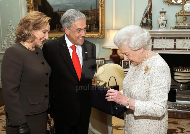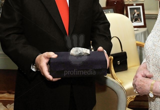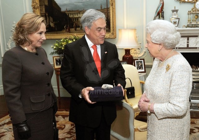 BritainŐs Queen Elizabeth II is given a piece of rock from the San Jose Mine by the President of Chile on October 18, 2010 in London. Mr Sebastian Pinera, who was accompanied by his wife Cecilia Morel Montes during a private meeting at Buckingham Palace in central London. 33 miners were trapped underground for 69 days at the San Jose mine in Chile.