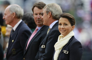 Jordan's Princess Haya bint Hussain (R), President of the International Equestrian Federation, waits before presenting medals for the Eventing World Championship at the World Equestrian Games in Lexington, Kentucky, October 3, 2010.