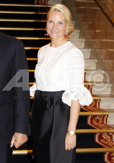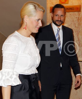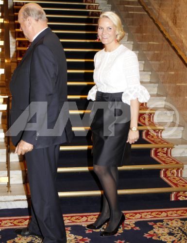 (L-R) Norway's Crown Prince Haakon, Leuthard's husband Roland Hausin, Queen Sonja, Swiss President Doris Leuthard, King Harald and Crown Princess Mette-Marit pose for photographers as the Norwegian Royal family were invited by the Swiss presidential couple for a concert at the Grand Hotel in Oslo, Norway, 15 October 2010.