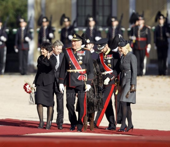 Oct. 14, 2010 - Oslo, OO, NORGE - OSLO, NORWAY: Swiss president Doris Leuthard and her husband Roland Hausin on state visit to Norway Thursday October 14th. Welcome ceremony at The Royal Castle by King Harald, Queen Sonja, Crown Princess Mette Marit and Crown Prince Haakon.