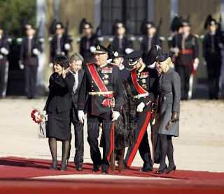 Norwegian King Harald (2R) and Queen Sonja (R) wal...