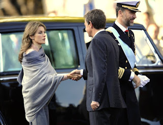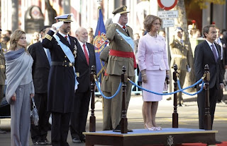 Spain's Princess Cristina and her husband, Princess Elena, Princess Letizia, her husband Prince Felipe, King Juan Carlos, his wife Queen Sofia and Spanish Prime Minister Jose Luis Zapatero listen to the national anthem as they attend the military parade during National Day on October 12, 2010 in Madrid.