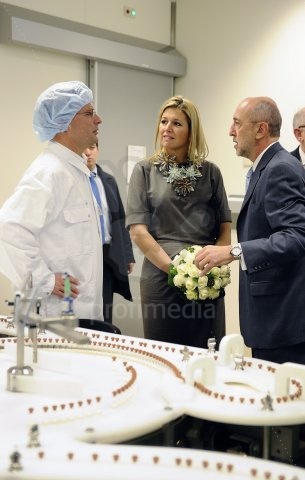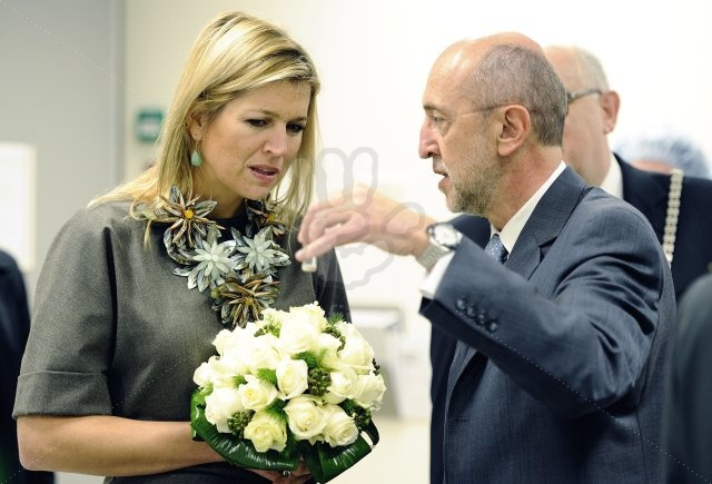 Dutch Princess Maxima talks to Raul Kohan (R), CEO of Global Animal Health of German pharmaceutical group Merck as she attends the opening ceremony of a specialized filling and freeze-drying unit for veterinary vaccines at its Biosciences Center Boxmeer, a lead site which produces vaccines and pharmaceutical products against bacterial, parasitological, and viral infections in cattle, sheep, swine, poultry, fish and companion animals in Boxmeer, on November 9, 2010.
