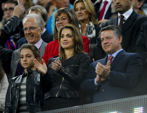 Jordan's King Abdullah II (R) and Queen Rania applaud at the end of the Spanish League football match Barcelona against Villarreal at the Camp Nou Stadium in Barcelona, on November 13, 2010.