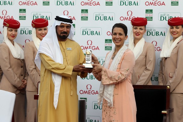 DUBAI, UNITED ARAB EMIRATES - DECEMBER 11: Princess Haya bint Al Hussein reveives a gift from Mohamed Juma Buamaim the Vice Chairman and CEO of 'golf in DUBAI' as recgnition of attending the prize giving ceremonies to award the prizes after the final round of the 2010 Omega Dubai Ladies Masters on the Majilis Course at The Emirates Golf Club on December 11, 2010 in Dubai, United Arab Emirates.