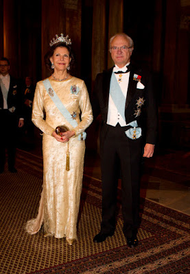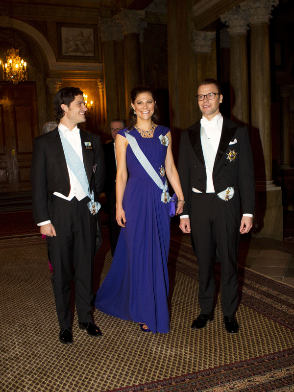 Sweden's Queen Silvia and King Carl XVI Gustaf (R) arrive at the King's dinner for the Nobel Laureates at the Royal Palace in Stockholm December 11, 2010. Seen behind are (L-R) Sweden's Prince Carl Philip, Crown Princess Victoria and Prince Daniel.