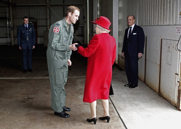 Britain's Queen Elizabeth talks with her grandson Prince William, watched by Prince Philip (R), after being shown around a Sea King search and rescue helicopter during a visit to RAF Valley, in north Wales April 1, 2011.