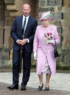 Britain's Queen Elizabeth II, right, and Alan Shearer, left, walk at Alnwick Castle in Alnwick, England, Wednesday, June 22, 2011.
