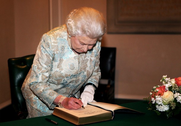 Queen Elizabeth II signs the visitor's book at Trinity House on June 20, 2011 in London. The Corporation of Trinity House is one of the country's oldest maritime organisations having been formed under a Royal Charter given Henry VIII in 1514. The Duke of Edinburgh was elected as the Master of Trinity House in 1969.