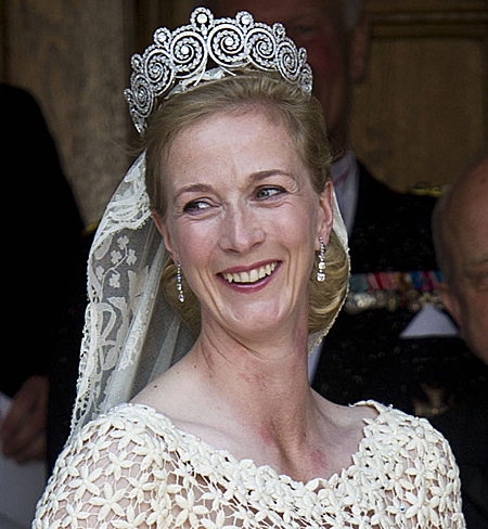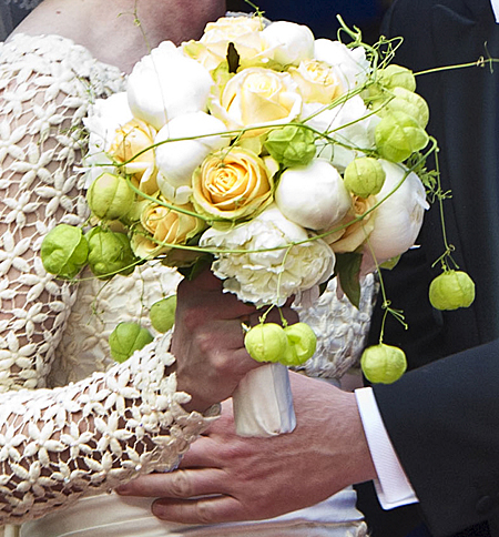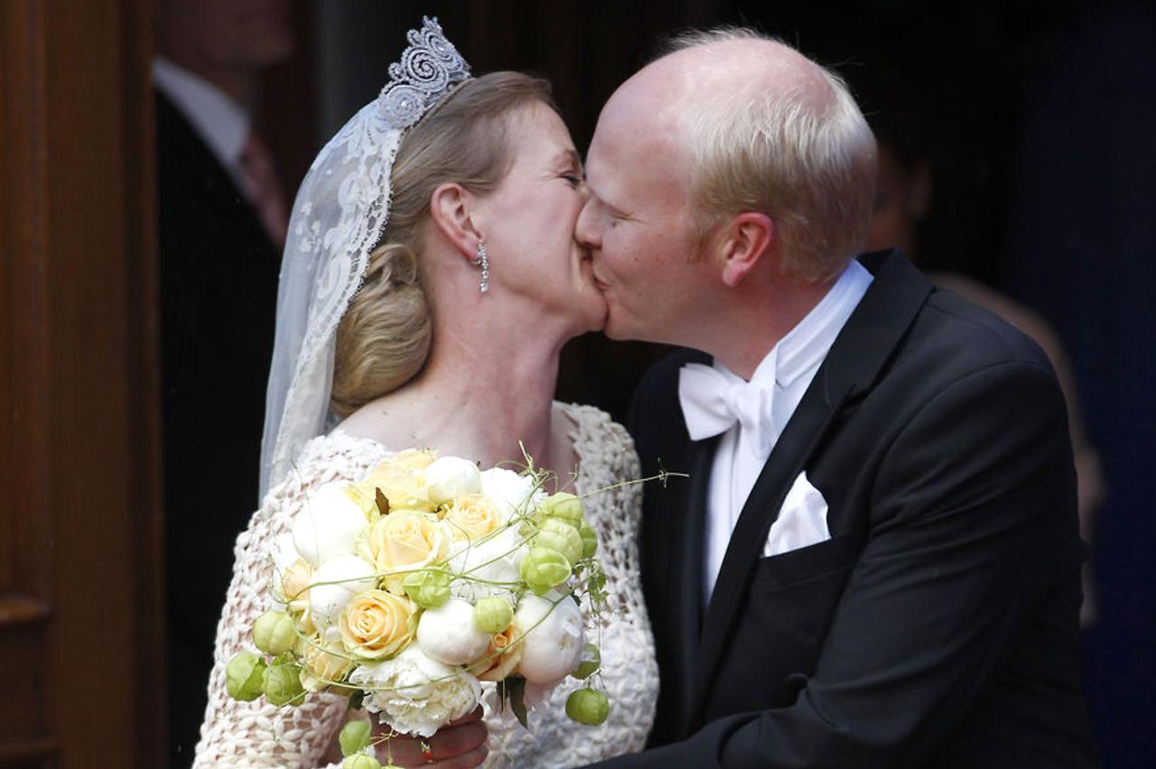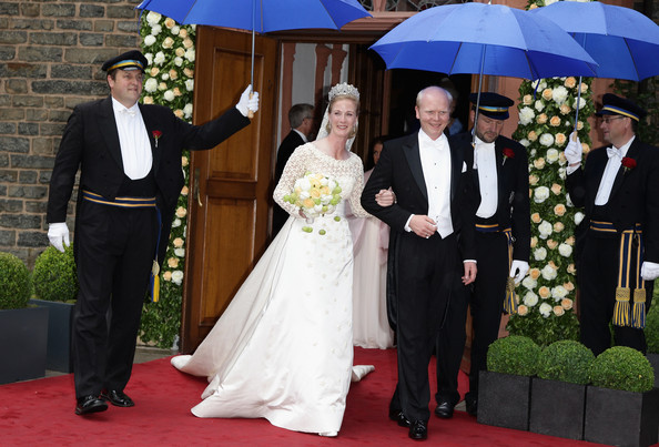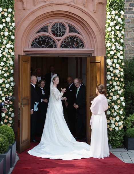 Princess Nathalie zu Sayn-Wittgenstein-Berleburg waits for her bridal bouquet prior to her wedding to Alexander Johannsmann